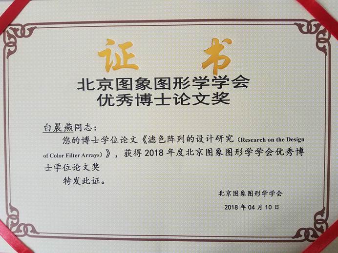 其中,av片 于剑教授和林宙辰教授(北京大学)联合指导的博士研究生白晨燕,赵瑞珍教授、岑翼刚教授联合指导的博士研究生王恒友,二人的博士学位论文《滤色阵列的设计研究》和《面向图像恢复的低秩矩阵重构算法研究》分别荣获北京图象图形学学会2018优秀博士学位论文奖。