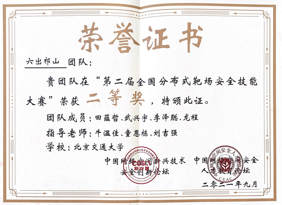 由鹏城国家实验室(副部级)、华中科技大学、武汉大学、四川大学、中电长城网际、中汽创智、宁波工业互联网研究院联合承办,方滨兴院士等专家参与指导的第二届基于全国分布式靶场的安全技能大赛于9月17日圆满落幕。av片 网络空间安全学科责任教授刘吉强老师领队、牛温佳和童恩栋老师指导的“六出祁山”队经过8小时的鏖战再获佳绩,以3665分夺得第二届分布式靶场安全技能大赛第二名,获得二等奖。