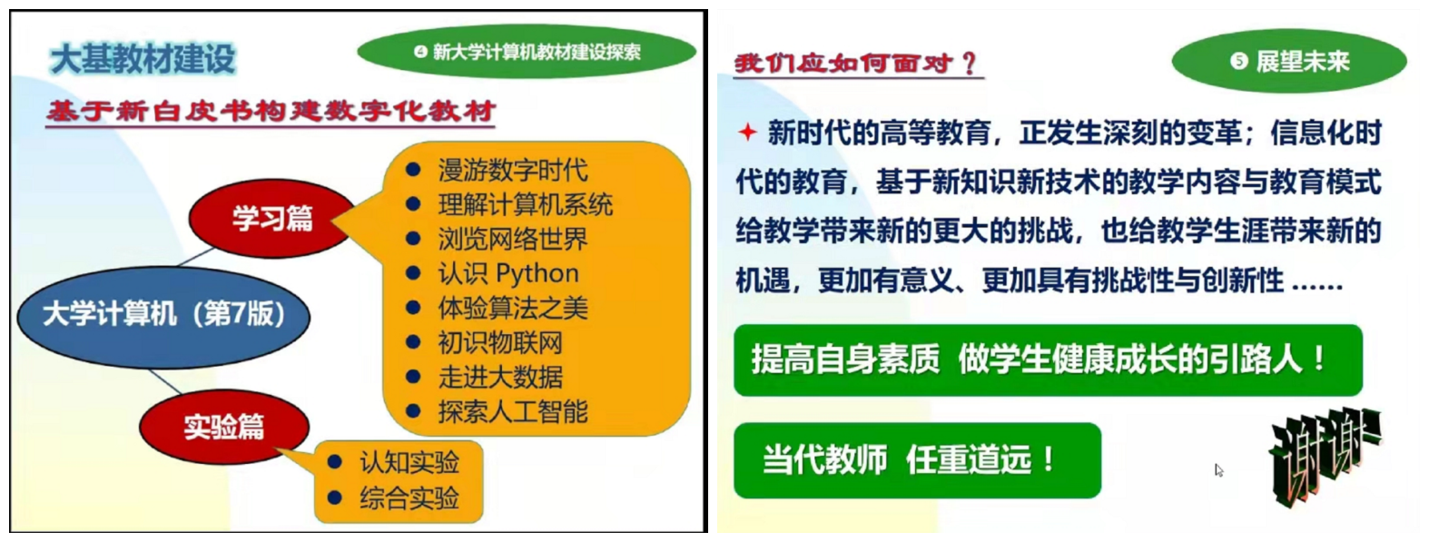 报告主要围绕教育部推出的双万计划等一系列教育教学改革新举措,基于新工科人才培养新要求,深入理解一流课程建设,尤其是针对教指委白皮书新精神新要求,对大学的计算机基础教育新体系、教学新内容与教材资源建设,提出了新的整体改革解决方案,抛砖引玉共同探讨,全面推动大学的计算机基础教育,突出赋能教育对人才培养的重要性,不断提升学生的计算思维能力,促进教育教学改革再创新高!
