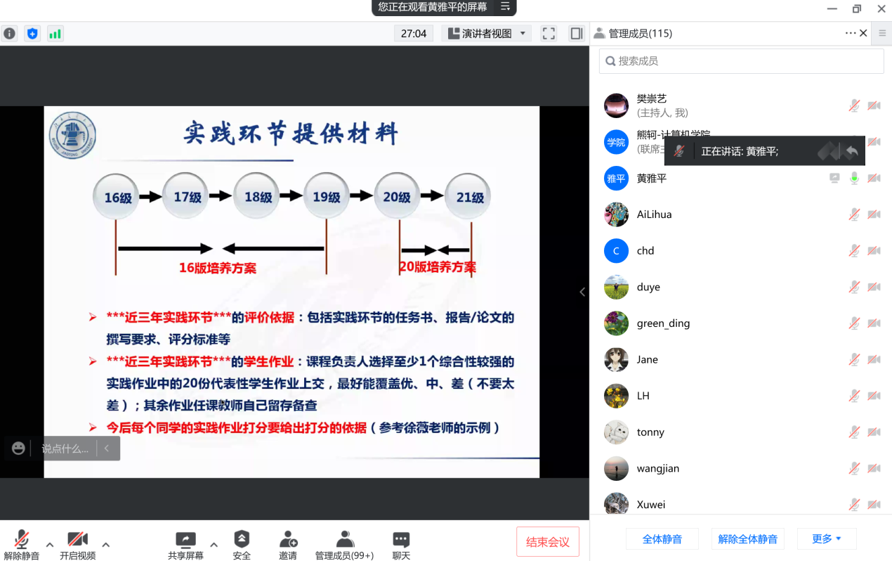 熊轲首先简要介绍了学院计算机科学与技术、信息安全两个专业工程教育专业认证工作的进展情况。计算机科学与技术专业责任教授黄雅平、副教授徐薇介绍了专业认证材料撰写的规范性,包括学生作业、成绩相关记录、成绩分析以及达成度评价报告等,并以核心课程《数据结构》为例,就课程负责人和任课教师如何撰写课程成绩分析报告、课程目标达成评价记录表、课程目标达成度评价表等进行了示范。