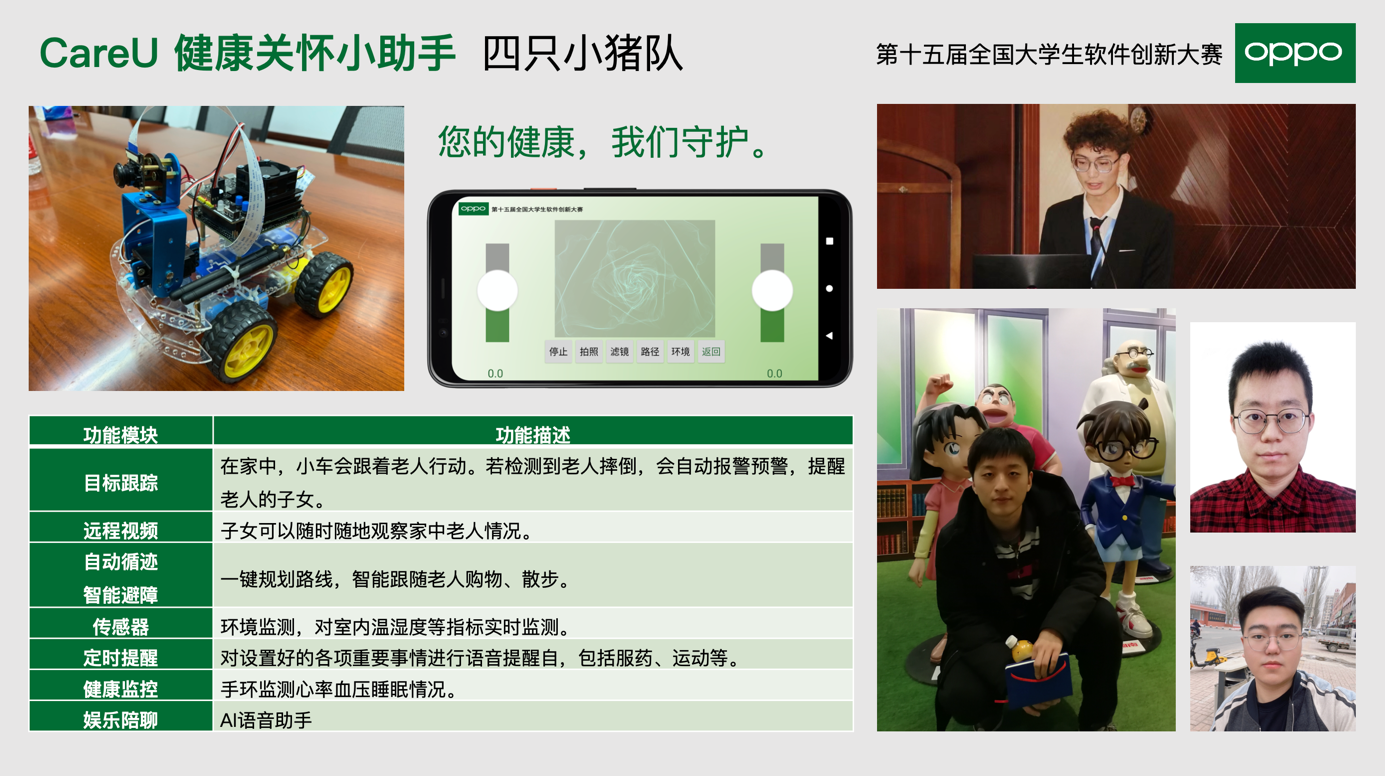 参赛队伍由两名研究生和两名本科生组成,他们分别是王志炜、王明泉、甘振良、赵路路。参赛作品《CareU:健康关怀小助手》针对目前我国的老龄化状况和养老形势,使用目标检测与追踪、人物姿态识别与摔倒检测、智能避障与路线规划等多项前沿技术,融合智能物联网小车、智能手机、智能可穿戴设备等多种设备,实现了全方位、多角度的老年人健康关怀系统。