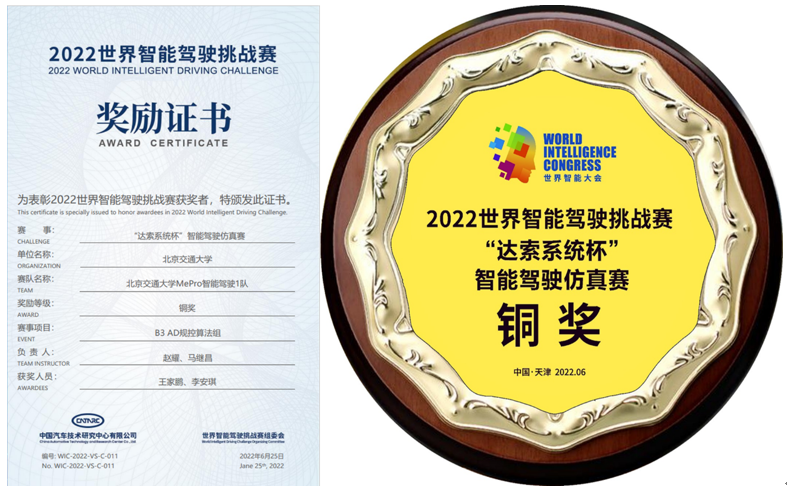 2022第六届智能车挑战赛(WIDC)于5月份在天津举行,WIDC由国家发改委、科技部、工信部和天津市政府等单位共同主办,是国内极具影响力的高水平智能驾驶赛事。本次大赛吸引了来自清华大学、天津大学、军事交通学院、哈尔滨工业大学、东南大学、吉林大学等顶尖高校,以及来自比亚迪、蔚来、小鹏、极狐、特斯拉等知名车企,共计百余支队伍参赛。av片 计算机学院MePro智能驾驶团队参加智能驾驶仿真赛,经过练习,预赛,决赛三个阶段,最终荣获铜奖。仿真测试场景中,验证了感知—决策—控制算法,测试场景案例包括:大曲率弯道行驶、障碍物绕行、拥挤路段通行、交通灯减速停车、施工路段绕行等功能模块。通过此次参赛,同样加速了实车算法的开发进度和功能迭代!