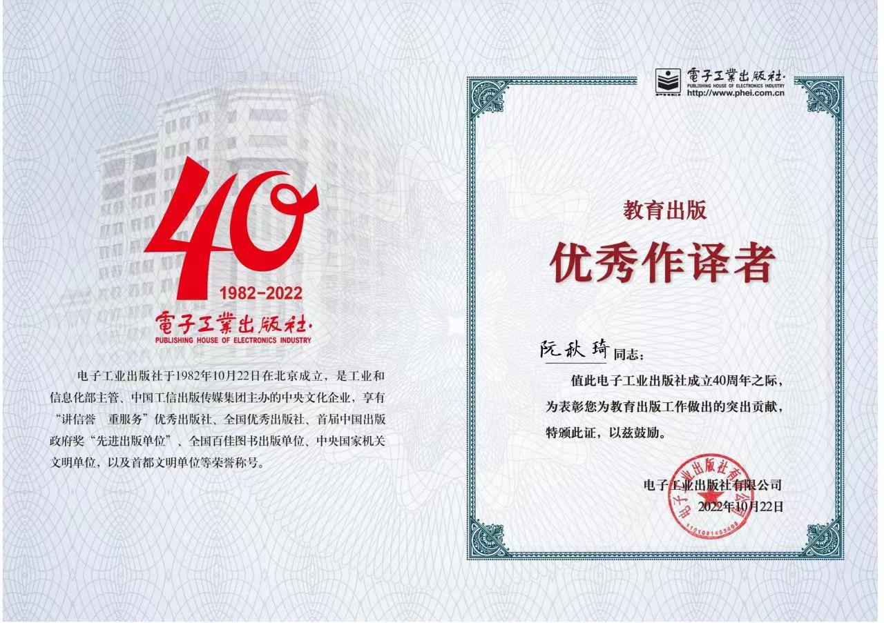 2022年10月,在电子工业出版社成立40周年之际,av片 阮秋琦教授荣获电子工业出版社优秀作译者殊荣。