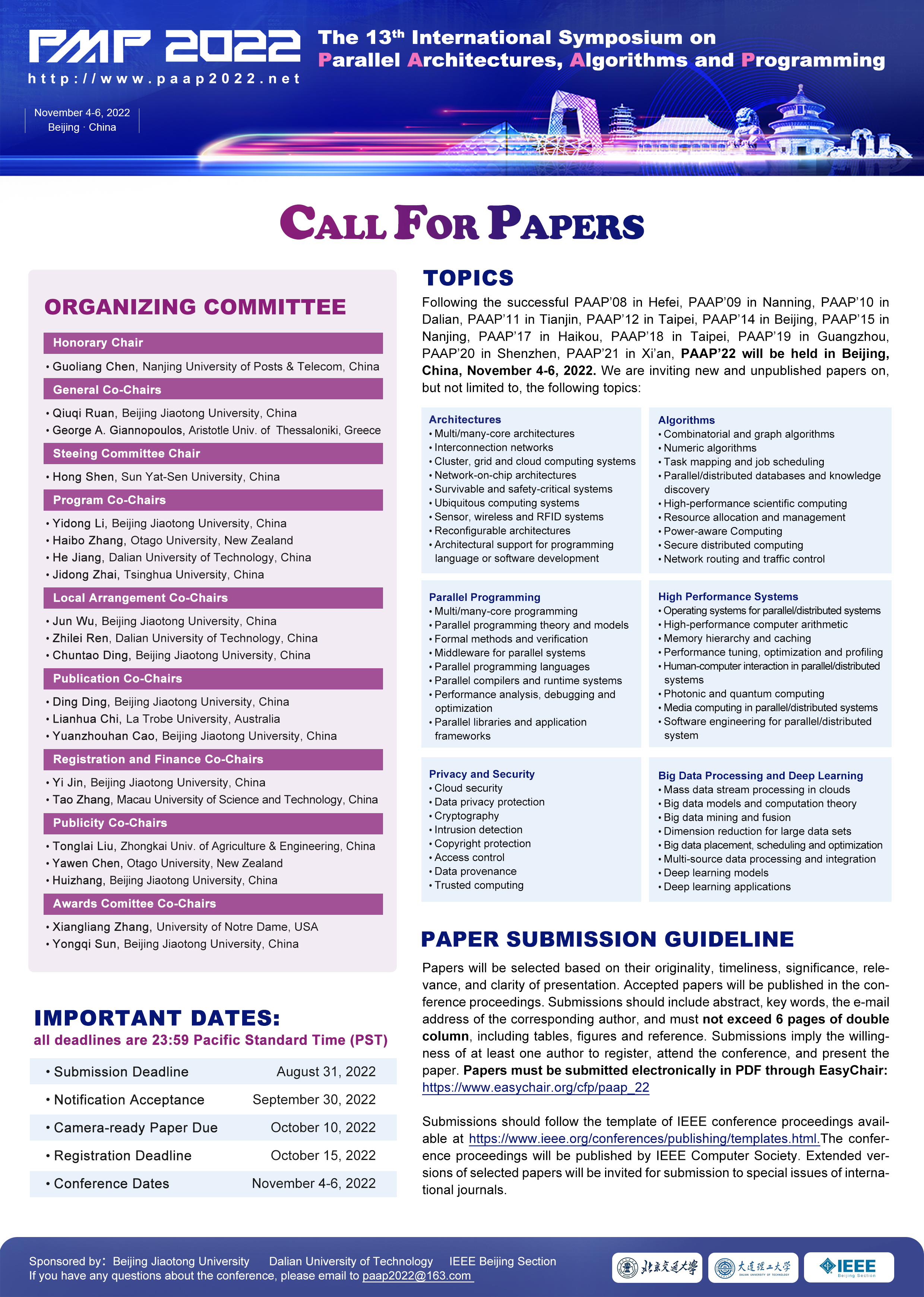 2022年第13届并行结构、算法与程序设计国际会议(PAAP 2022)将202211在中国北京召开,此次大会由av片 计算机与信息技术学院主办。大会致力于为学术界和工业界的科学家和工程师提供一个论坛,展示他们在并行结构、算法与程序设计各方面的研究成果和开发活动。欢迎各位老师和同学踊跃投稿、参会,共同探讨、交流相关领域的最新研究进展及面临的机遇与挑战。