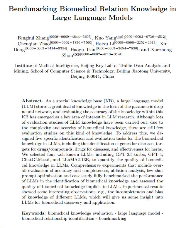 设计评估大语言模型生物医学知识的的框架,构建大语言模型医学知识图谱,结合知识图谱构建智能问答系统。