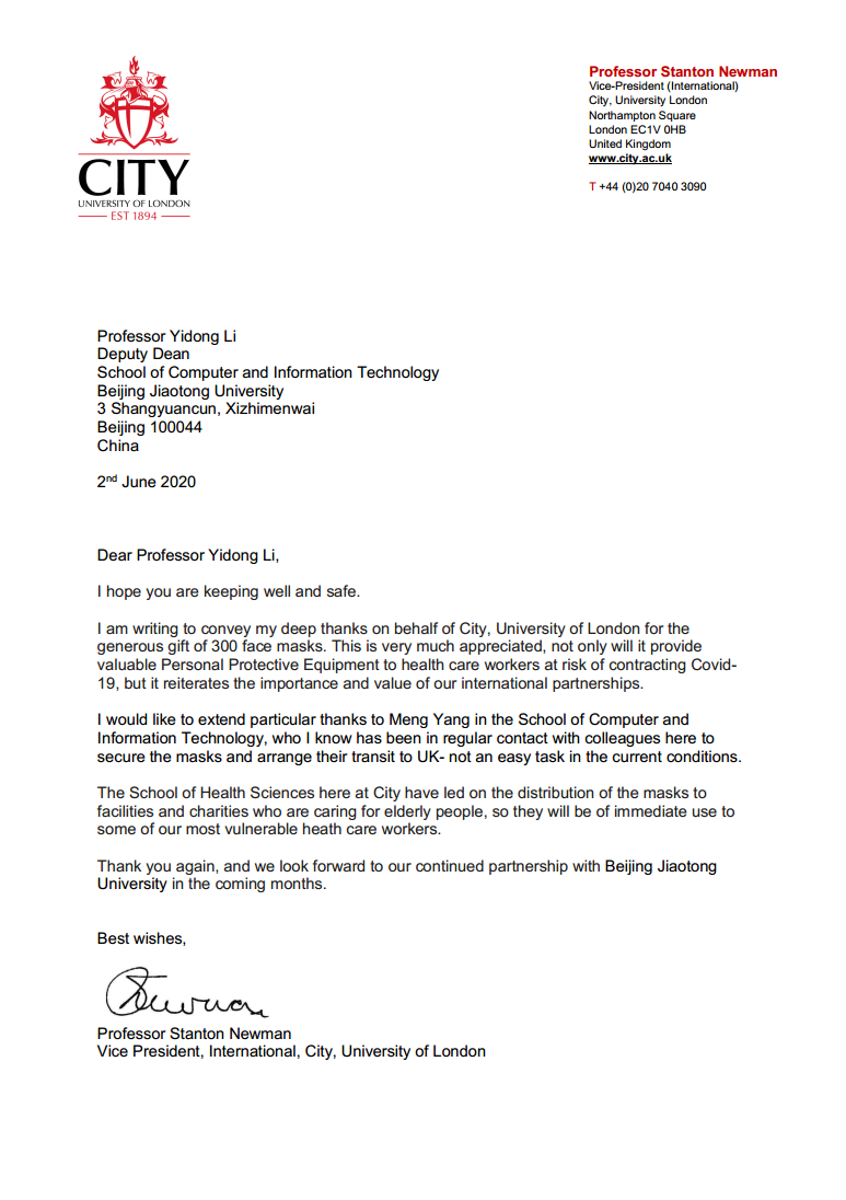 伍伦贡大学电子,计算机与电信工程学院副院长Christian Ritz教授在信中写到,“我代表伍伦贡大学,感谢您的支持。这段时间,尽管新冠肺炎已经影响了我校的基本运转功能,但我们从未忘记和北京交通大学的友谊和合作”,“北京交通大学是我们的重要合作伙伴。我相信我们可以共渡难关,如果贵校需要任何帮助,我们一定伸出援手。我希望在未来进一步加强双方合作”。伦敦城市大学副校长Stanton Newman教授在信中写到,“我代表伦敦城市大学向您表示深深的感谢,您慷慨捐赠的口罩不仅向奋战在抗击新冠肺炎一线的工作人员提供了宝贵的个人防护物资,更是重申了我们国际合作关系的重要性和价值”,“我想特别感谢计算机学院的杨萌女士,她和我的同事们多次沟通,最终将口罩顺利寄到了英国,在目前的情况下这不是一件容易的事”。