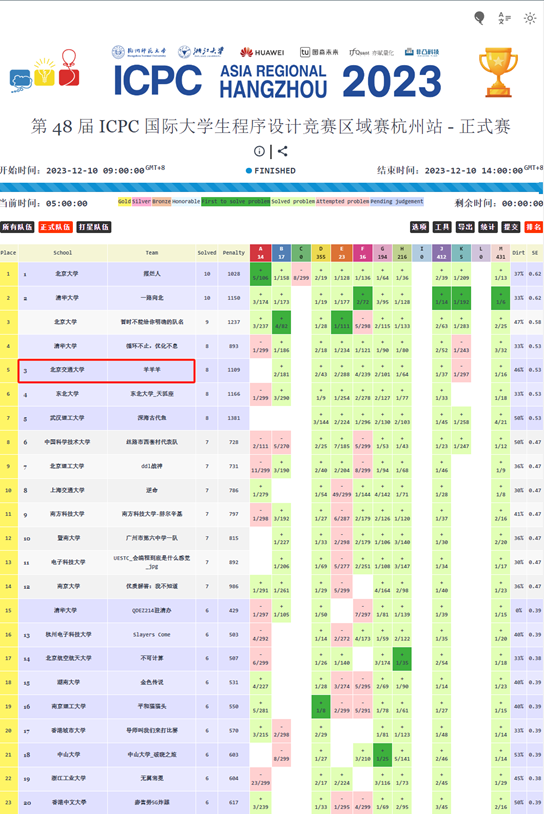 48ICPC国际大学生程序设计竞赛区域赛杭州站榜单