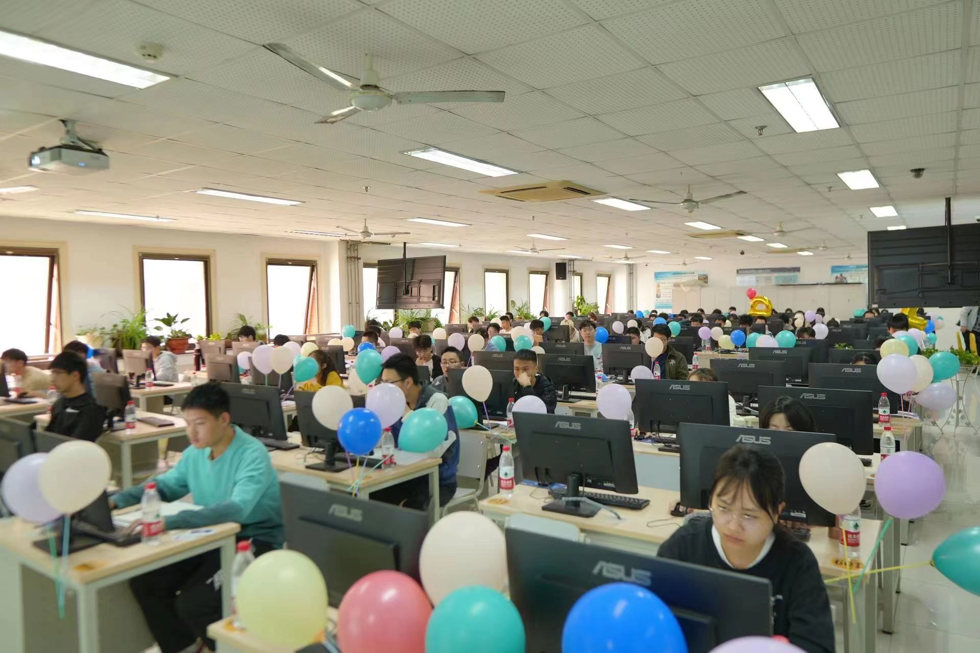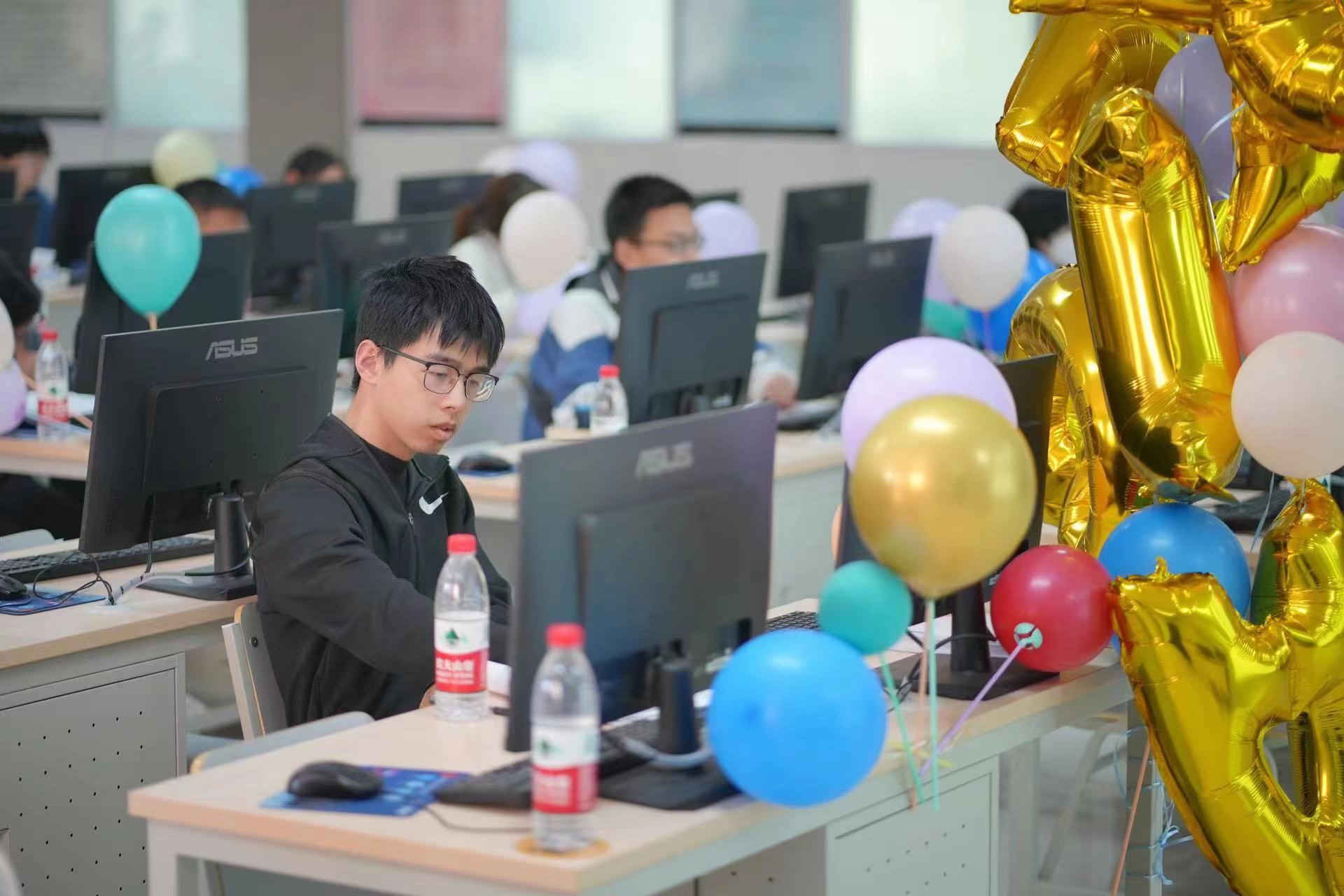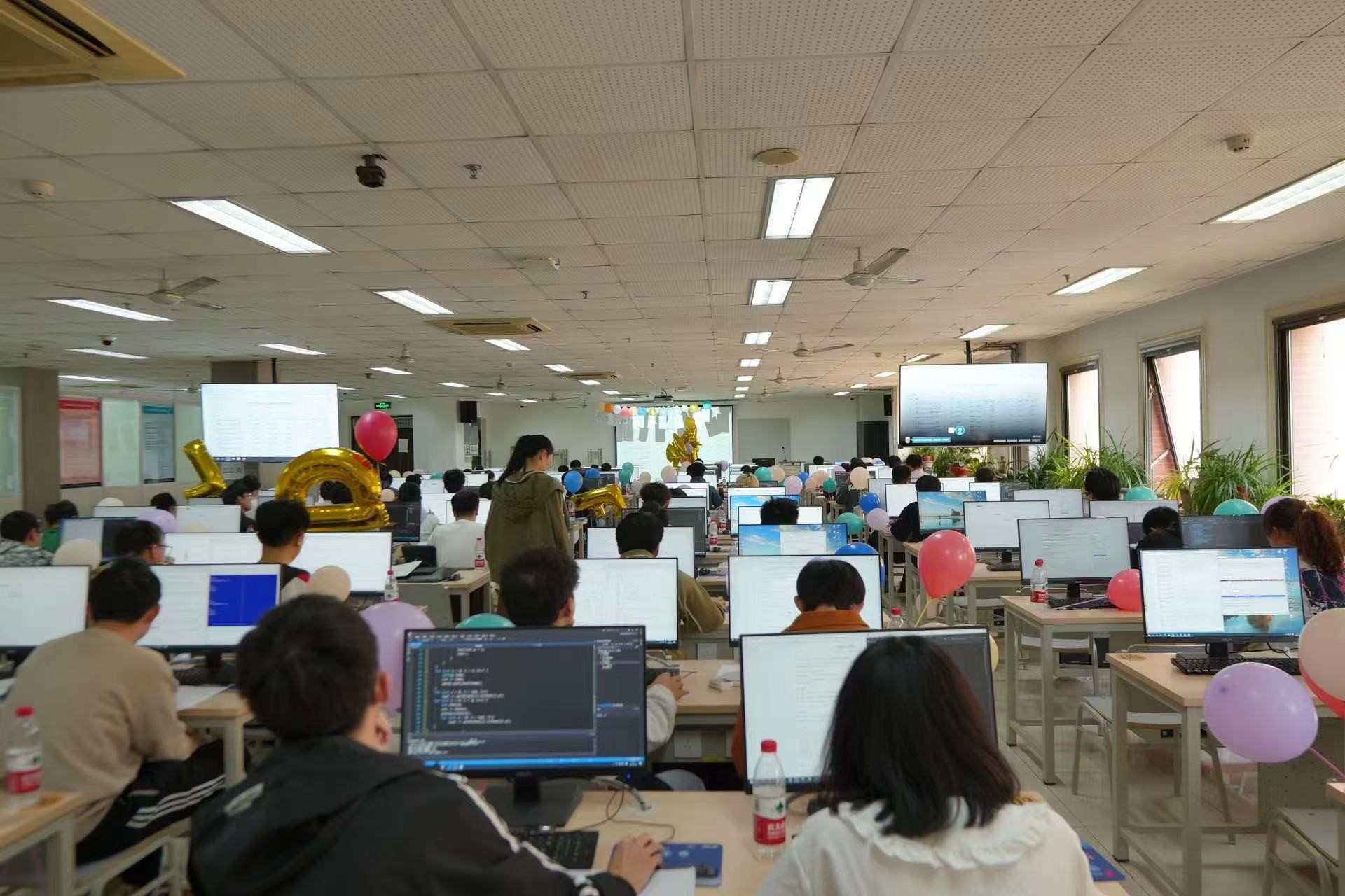 此次大学生程序设计竞赛有来自包括威海校区在内的全校13个学院的393名本科同学报名参加,创历史新高。根据赛程安排,本次竞赛于2023.4.7-10日启用了网络预赛,经过代码查重等环节,全校共有212名同学获得现场赛参赛资格(含威海校区20名同学)。本次赛事活动还邀请了北京师范大学、中国传媒大学、北京化工大学等部分兄弟院校以及衡水中学的同学远程参赛,切磋技艺,共同交流。比赛延续了一校的办赛模式,同一份赛题、同一个排行榜单、不同年级的同学同台竞技,在保障比赛公平、公正和安全的前提下,比赛在主校区和威海校区的机房同时开展。不同现场赛点的同学都只能在规定的机房参赛,访问同一个比赛服务器,查看同一个排行榜单,除此之外不能访问任何其他网络资源;参赛选手提交的所有解题代码均由机器依据数据进行自动评测,排除了人为因素,保障了赛事的公平公正。