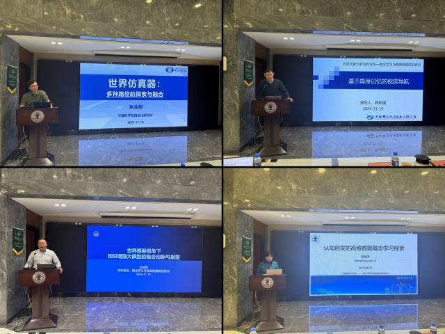 19日,中国科学院自动化所张兆翔研究员以“世界仿真器:多路径的探索与融合大模型技术”为题,分享了其团队在世界仿真器相关路线上的初步探索及应用落地成效。中国科学院计算所蒋树强研究员以“基于具身记忆的视觉导航”为题,分享了其团队在具身导航的最新研究方向及进展,并进行了虚拟到现实环境的演示。同济大学王昊奋研究员以“世界模型角度下知识增强大模型的融合创新与展望”为题,分析了世界模型和知识增强大模型前沿研究案例和最新技术发展趋势,并结合垂直领域的落地应用展望了未来技术范式。北京交通大学景丽萍教授以“认知启发的高维数据概念学习探索”为题,从心理学与认知科学角度出发,探索高维数据概念表示、学习和解释理论和方法,并对认知启发的概念学习进行了展望。